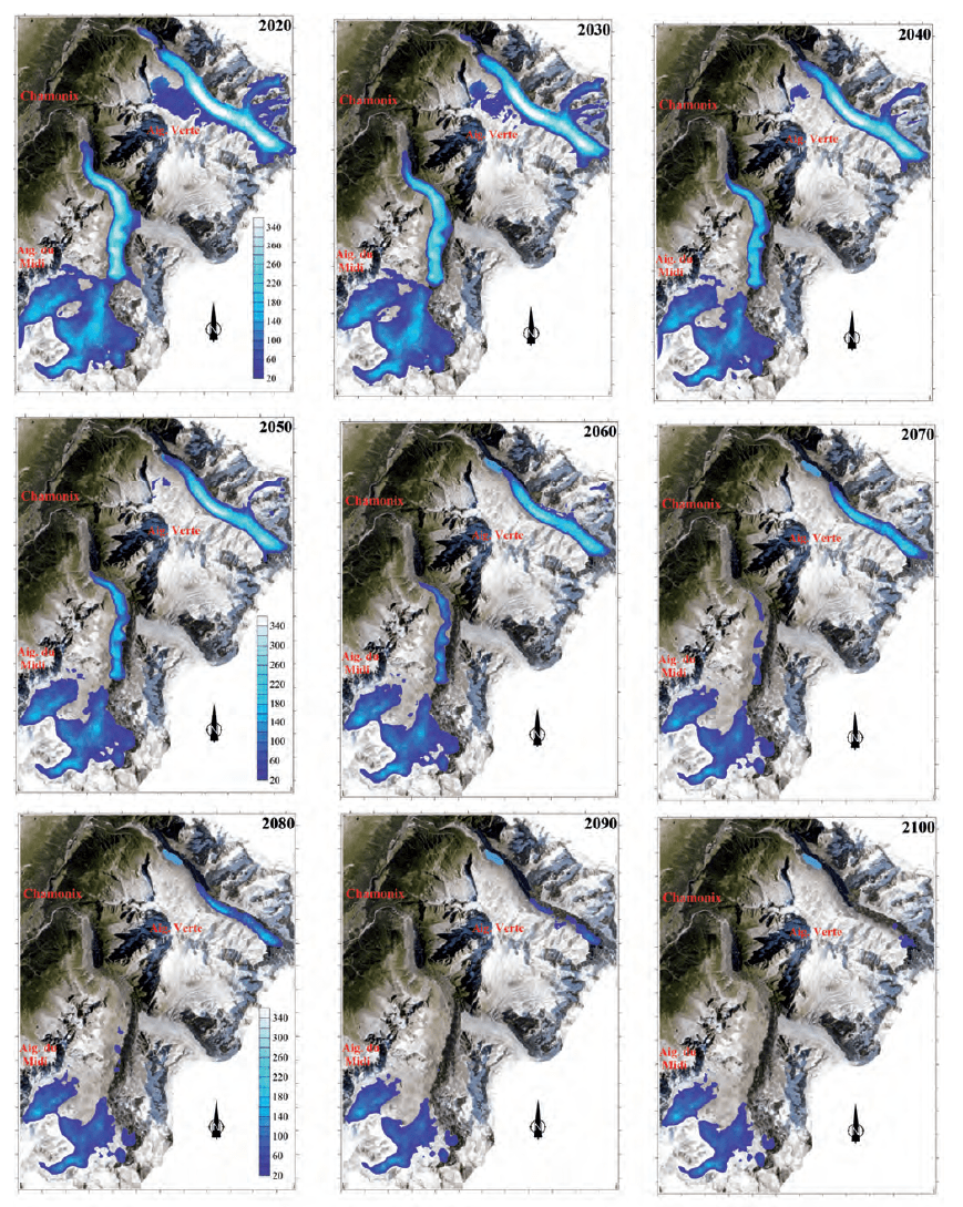 Des modélisations ont été réalisées sur les deux plus grands glaciers des Alpes françaises afin d’estimer leur évolution au cours du XXIe siècle. Pour un scénario climatique intermédiaire avec réduction des émissions de gaz à effet de serre avant la fin du XXIe siècle (RCP 4.5), les simulations indiquent que le glacier d’Argentière devrait disparaître vers la fin du XXIe siècle et que la surface de la Mer de Glace pourrait diminuer de 80 %. Dans l’hypothèse la plus pessimiste d’une croissance ininterrompue des émissions de gaz à effet de serre (RCP 8.5), la Mer de Glace pourrait disparaître avant 2100 et le glacier d’Argentière une vingtaine d’années plus tôt.