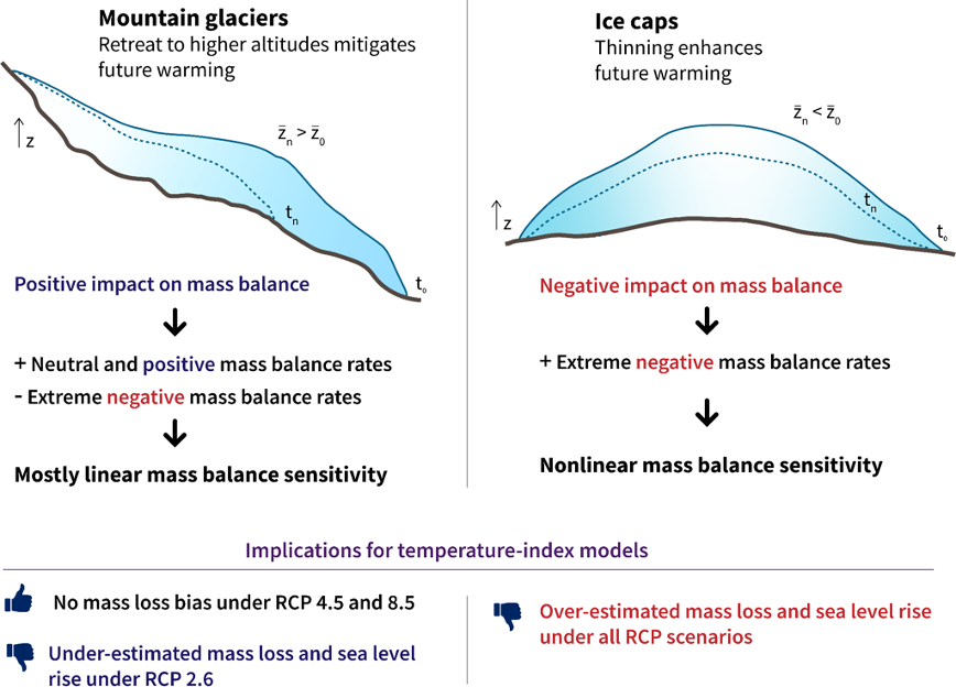 under low-emission scenarios and the behaviour of flatter glaciers and ice caps are likely to